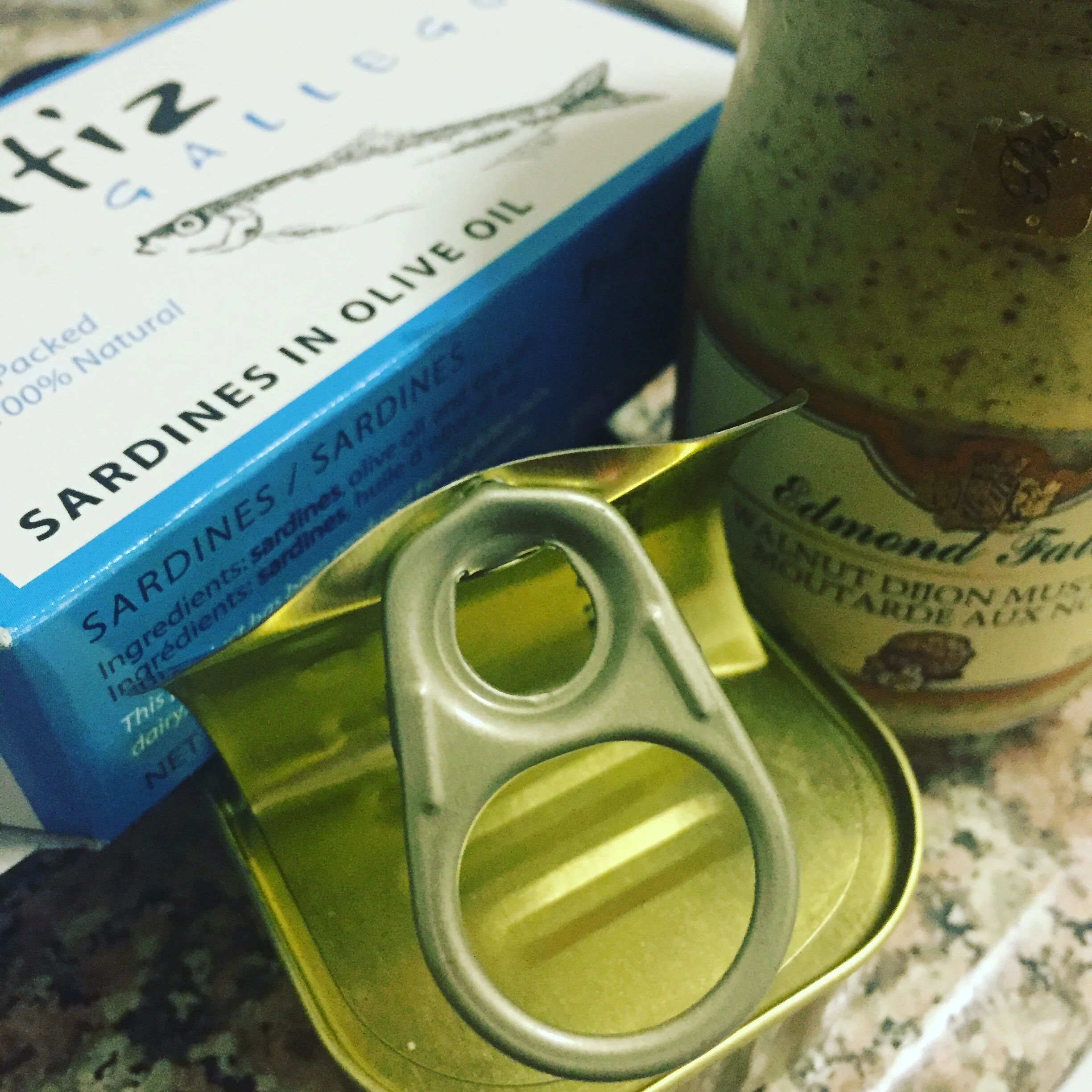 Assemble dressing directly in sardine can using oil from can mixed with dijon mustard